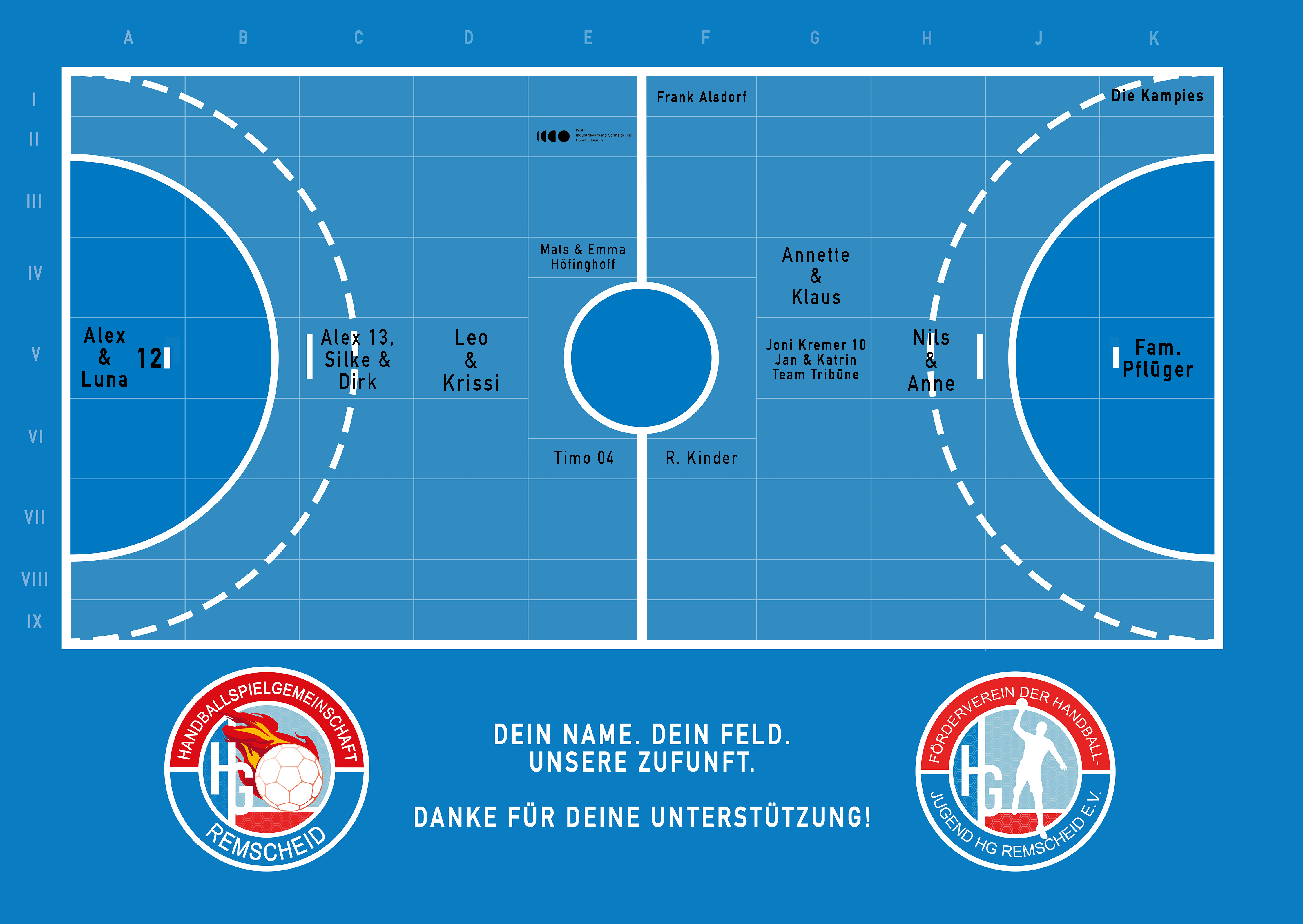 Unter dem Motto „Mach Dein Feld klar“ hat der Förderverein der Handballjugend basierend auf einer Idee von Jugendkoordinator Frank Alsdorf ein virtuelles Spielfeld ins Leben gerufen. Für 25, 50 oder 250 Euro könnt ihr ein Feldstück erwerben und es mit eurem Namen, einem kurzen Spruch oder sogar einem kleinen Logo gestalten.