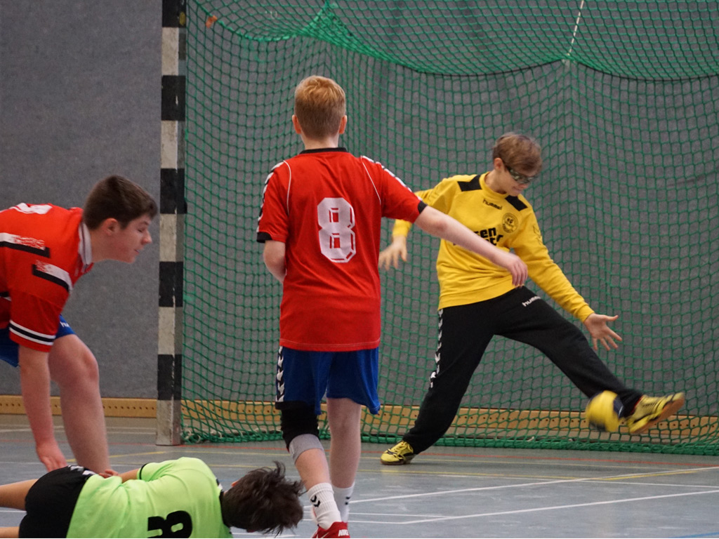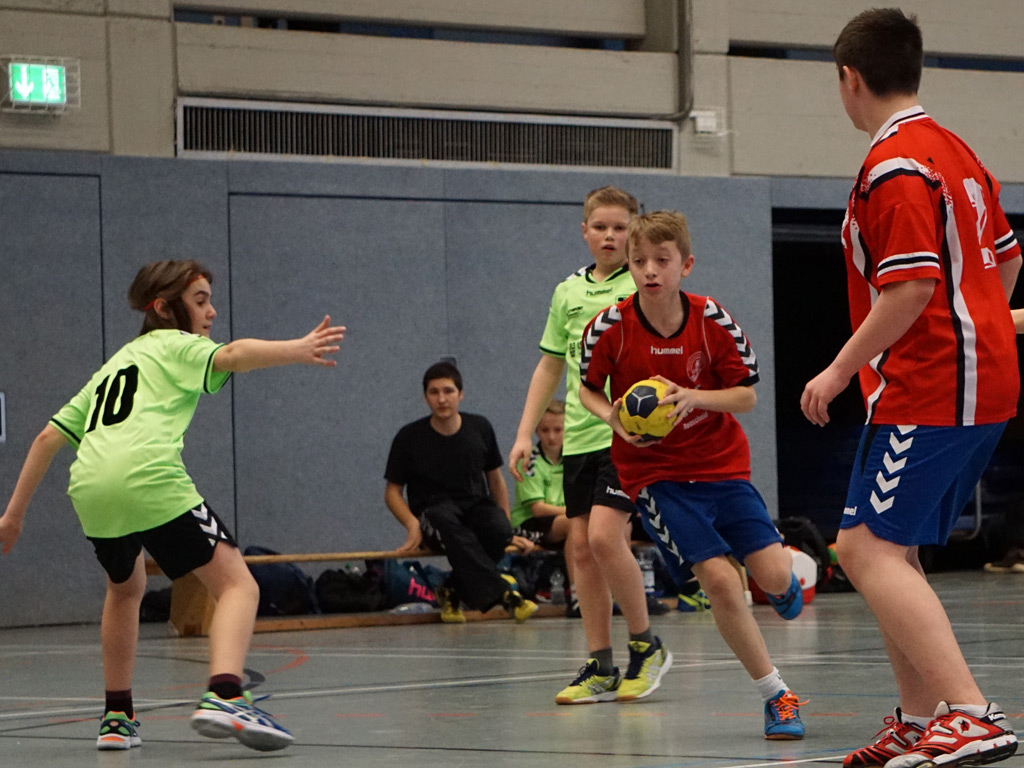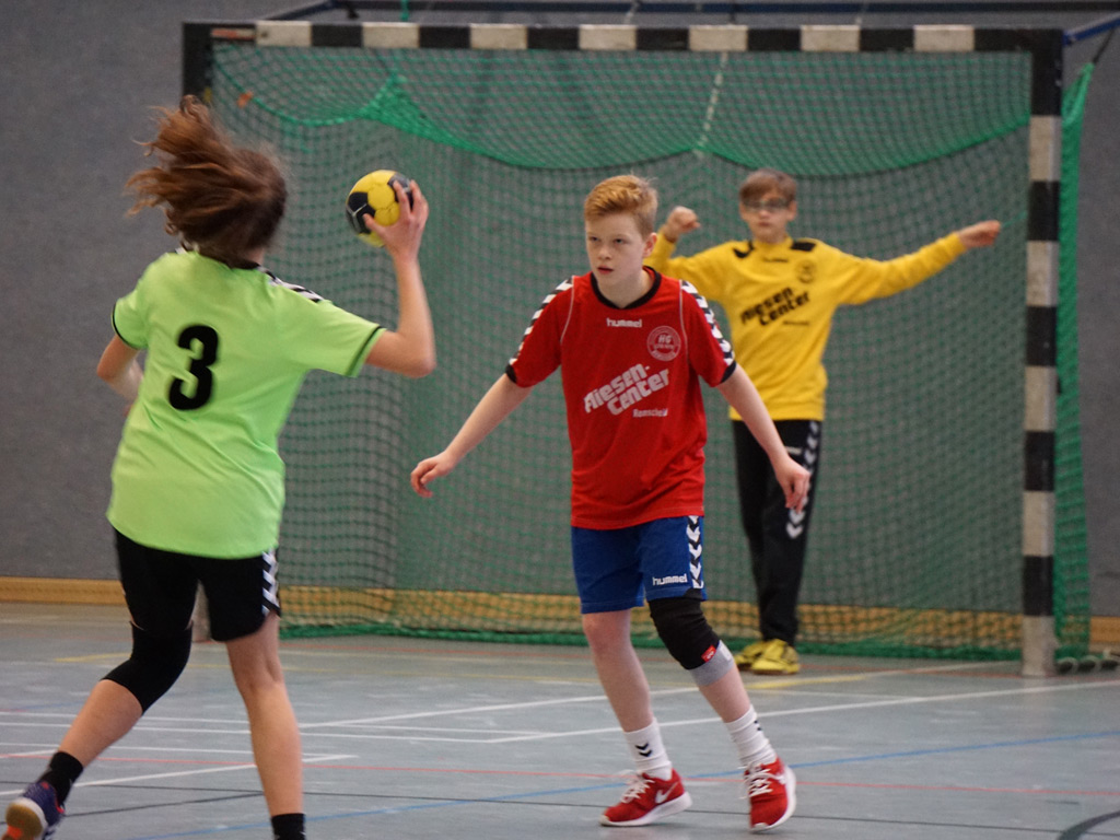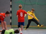 Wie letzte Woche waren wir wieder nur zu acht, doch auch der Gegner brachte nur neun Kinder an den Start. Und dieser Start verlief sehr holprig. Ein schneller Doppelschlag und wir lagen nach einer knappen Minute bereits 0:2 hinten. Bis zur 7.Minute konnten wir dann ausgleichen (3:3), bevor der Gastgeber wieder auf 3:5 vorlegte (10.). Nach 13 Minuten (4:6) hatten unsere Jungs dann aber den Gegner entschlüsselt und festgestellt, dass gerade auf halblinks immer wieder große Lücken in der Abwehr aufgingen. Mit einem glatten 6:0-Lauf bis zur Pause drehten wir das Spiel und führten mit 4 Toren.