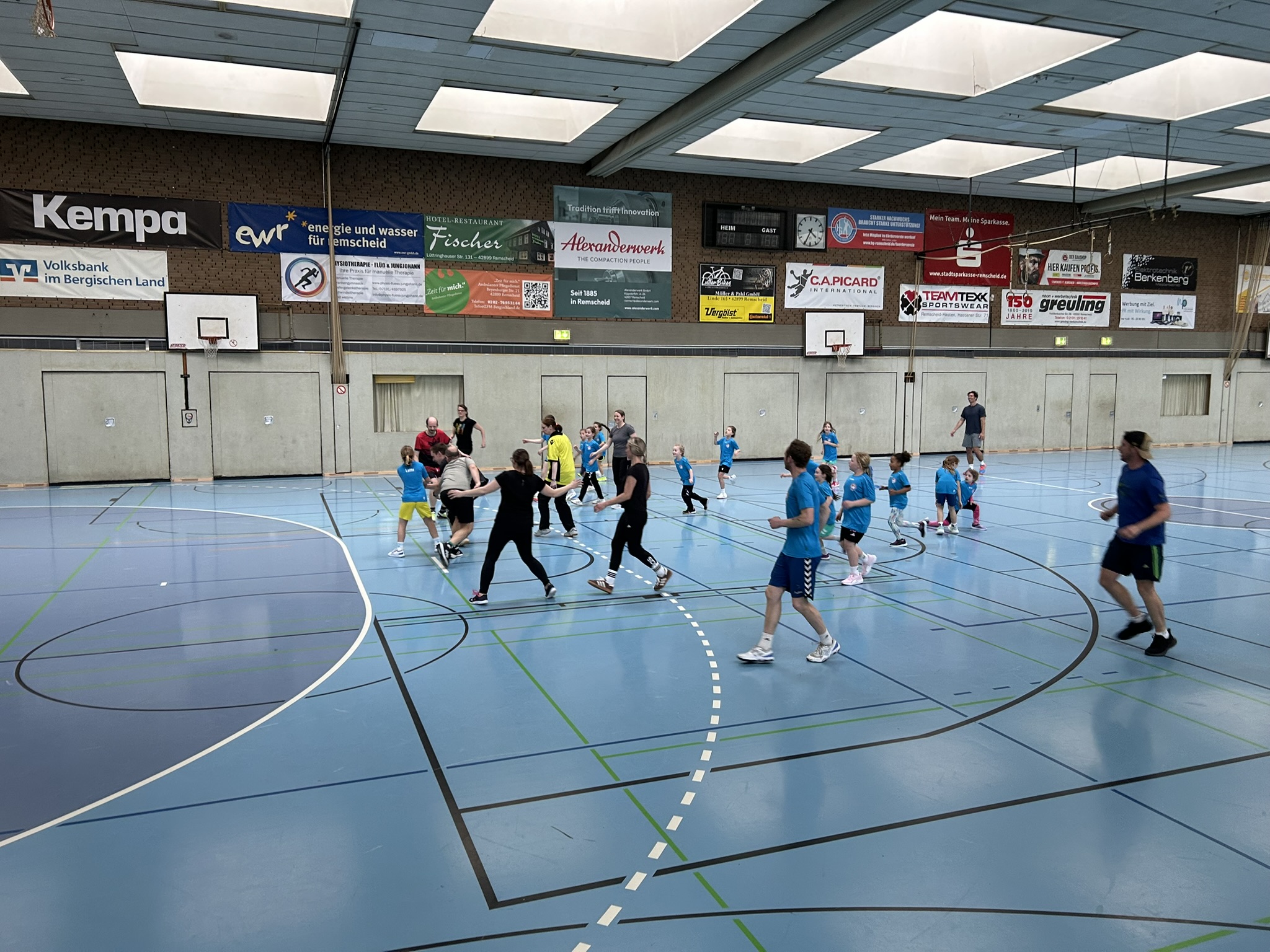 Im Anschluss ging es gemeinsam nach Remscheid in die Neuenkamper Halle zum großen Saisonabschluss der weiblichen F-Jugend. Drei Stunden lang wurde gespielt, gelacht und getobt – ob beim Fangen, Brennball, Völkerball oder natürlich Handball. Das Besondere: Auch viele Eltern schnürten die Sportschuhe und duellierten sich mit ihren Kindern. Dank eines bunten Buffets war auch für das leibliche Wohl bestens gesorgt. Ein besonderes Highlight waren die einheitlichen Shirts mit Namen, die alle Mädchen als Saisonabschlussgeschenk überreicht bekamen.