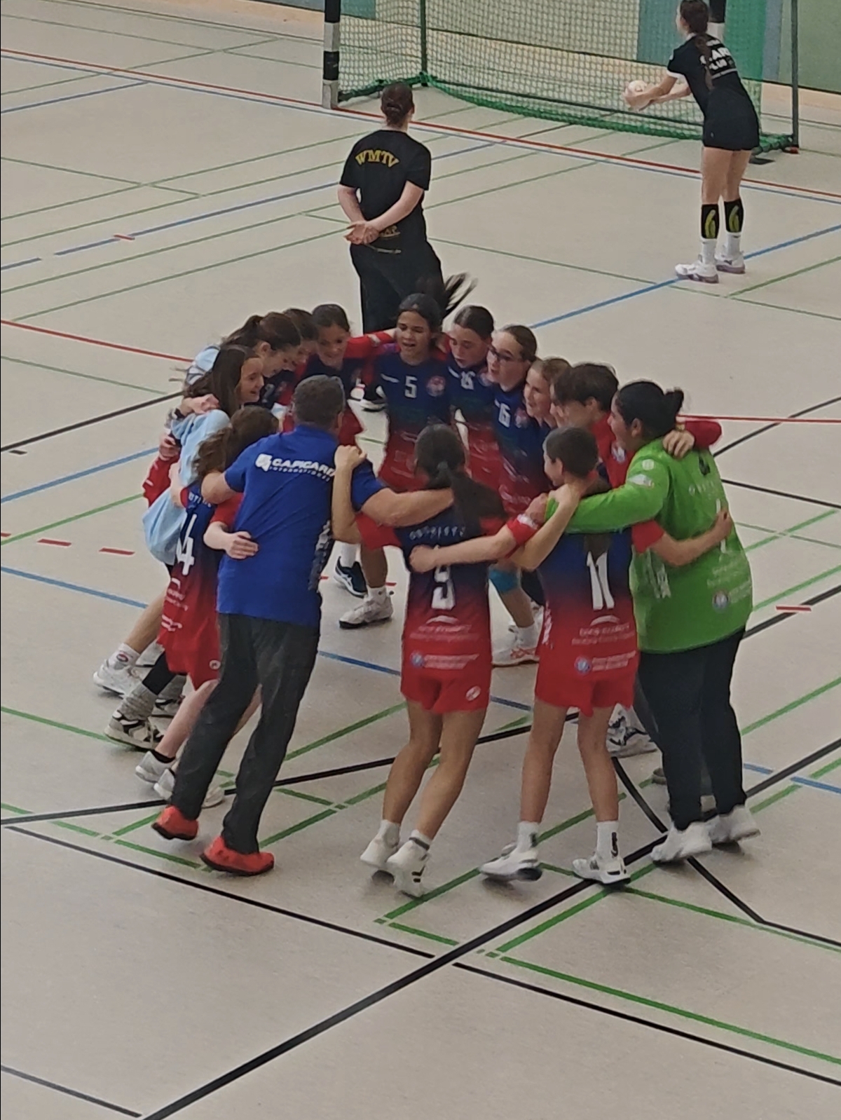 In der zweiten Hälfte wendete sich das Blatt und die HG’lerinnen gingen mit mehr Überzeugung und Druck auf die Abwehrreihe des WMTV, wodurch sich die Torquote deutlich erhöhte. So konnten jetzt im Rückraum auch Jojo, Leni und Ronja (3 Tore direkt nach der Pause) mehr Akzente setzen. In der 35. Spielminute wurde das erste Mal der Ausgleich zum 11:11 bejubelt. In der 38. Minute verpasste das Trainer-Duo D. Niedzwiadek / K. Niedzwiadek dem Spiel mit der späten Einwechslung von Naila die endgütige Wende. Erst unsicher auf Rückraum-Rechts erzielte Naila innerhalb von drei Minuten 3 Tore von Linksaußen und brachte so die RS-Mädels auf die Siegerstraße. Leni machte dann mit einer schönen Passtäuschung und einen Durchbruch auf Halbrechts den Deckel drauf.